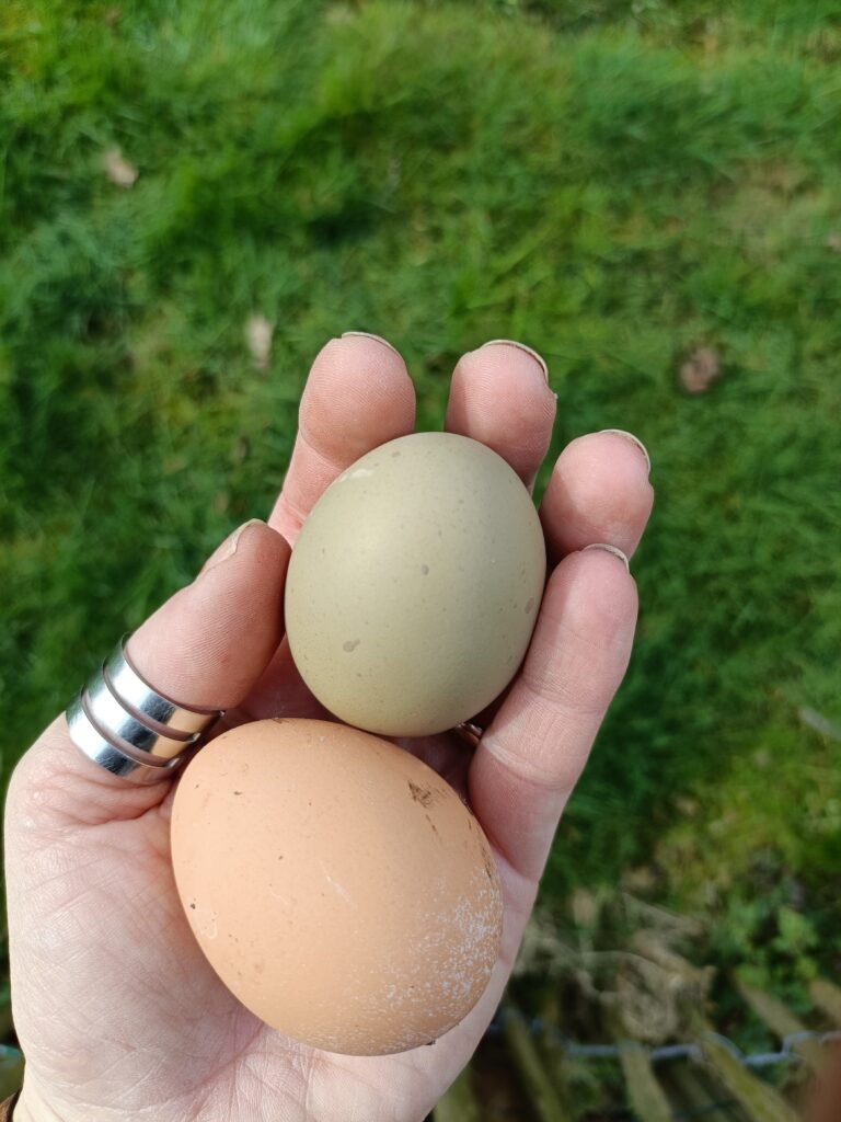 En toen afgelopen weekend, dat groene ei. Dus toch weer terug graven naar de klant van vorig jaar die ons een poosje terug had bericht over de groenen eieren. Haar kuikens zijn van een rood/bruin Isabrown haan en daarbij liepen Isabrown hennen en Australorp hennen. Daarvan heeft zij 1 haan en een aantal hennen van bijelkaar lopen. Genetisch is daar iets moois ontstaan en heeft onze rood/bruine haan toch iets bij zich wat dus de groene eieren verklaard…. Want ook wij hebben van die zelfde haan een aantal dochters gehouden.