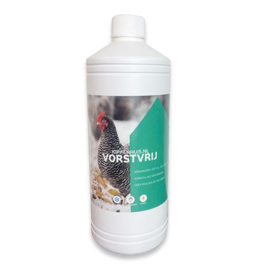 Voorkom bevroren drinkwater voor kippen en ander pluimvee. Vorstvrij 1000ml is een middel op basis glycerine waardoor vriespunt van het drinkwater verlaagd naar circa -9C. Met de Nederlandse vorst is het drinkwater hierdoor praktisch altijd ijsvrij. Vorstvrij kun je maximaal 14 dagen aaneengesloten geven en heeft in die periode geen invloed op de kippen of eieren.